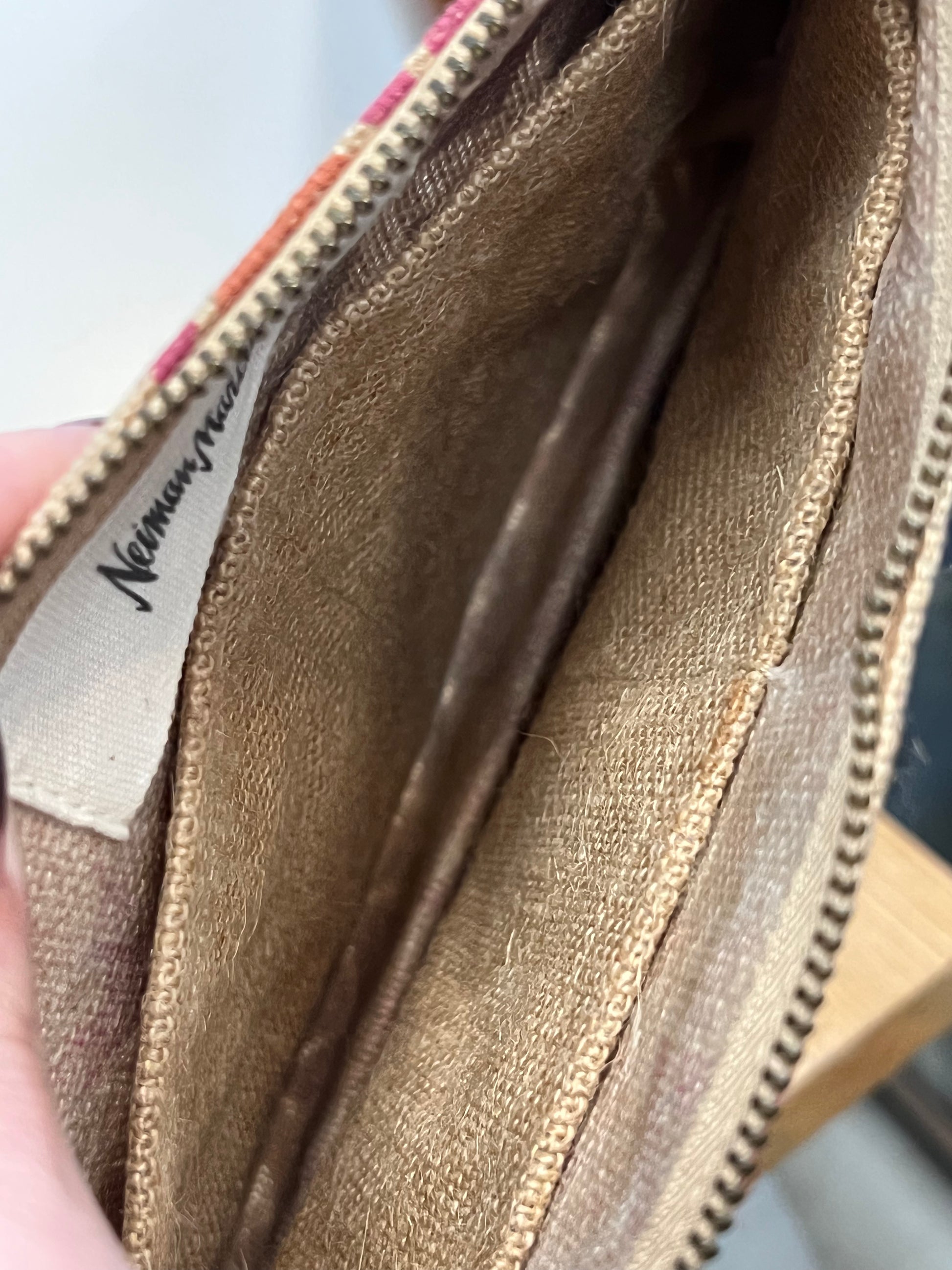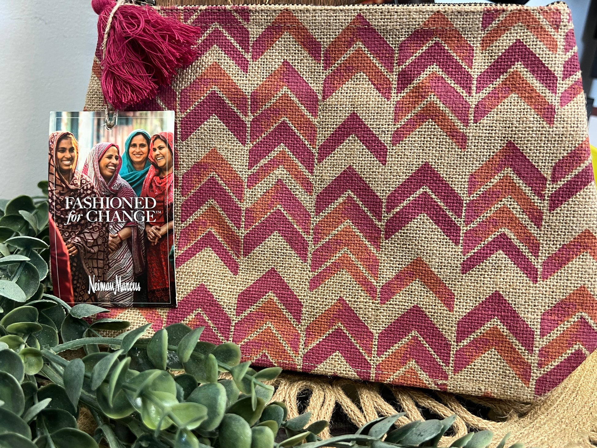 Brand new, featuring tags, this stylish burlap makeup bag showcases a chevron print design. It includes a zip closure for secure organization.